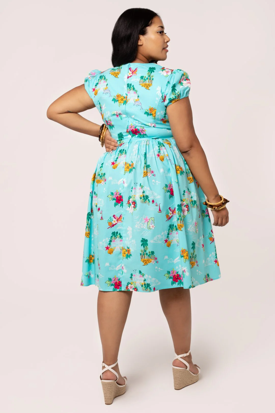 Faites un voyage paradisiaque avec la robe Ayanna. Cette robe en coton extensible de style années 50, arbore une base turquoise, illustrant des îles tropicales