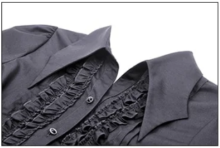 Son col large et structuré affirme un style audacieux et élégant à la fois. Les volants sur le buste apportent une note romantique et sombre, parfait équilibre entre douceur et caractère. Sa coupe cintrée souligne la silhouette tout en allongeant la ligne du buste. Facile à associer : glissez-la sous un corset, une robe bustier ou portez-la seule avec un pantalon taille haute.