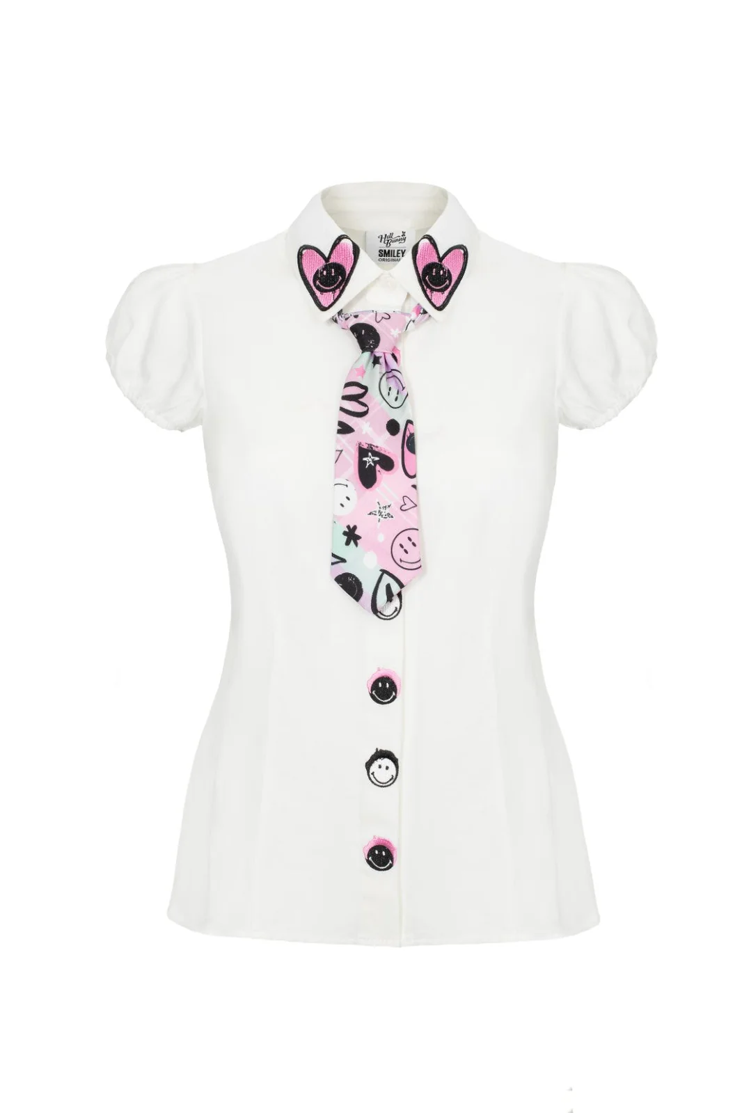 Issue de la collaboration entre Hell Bunny et Smiley® Originals, la blouse Robbie est un modèle original ! Cette jolie blouse semi-ajustée arbore de spectaculaires broderies cœur Smiley® sur le col montant pointu et des motifs brodés le long de la patte de boutonnage dissimulée pour encore plus de style. Les manches courtes bouffantes sont froncées et dotées de poignets élastiqués pour plus de confort et de style. Que vous optiez pour une tenue habillée ou décontractée, la cravate amovible en tartan imprimé est l’accessoire idéal. Apportez une touche de gaieté à votre garde-robe avec la blouse Robbie !