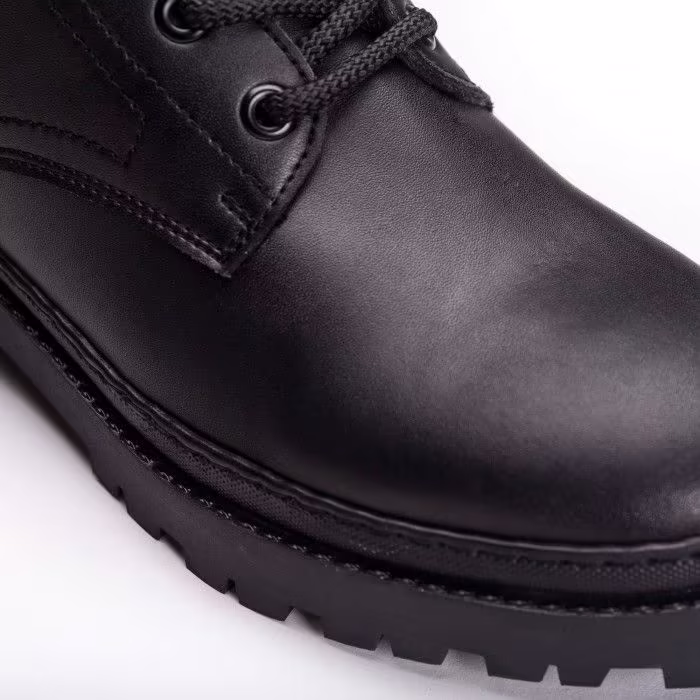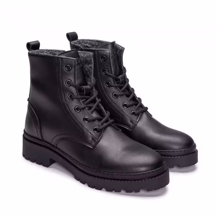 Découvrez Kane Black : des Bottes noires pour femme éco-responsables avec des lacets et une doublure en coton organique, combinant chaleur, allure, et durabilité.