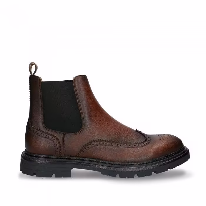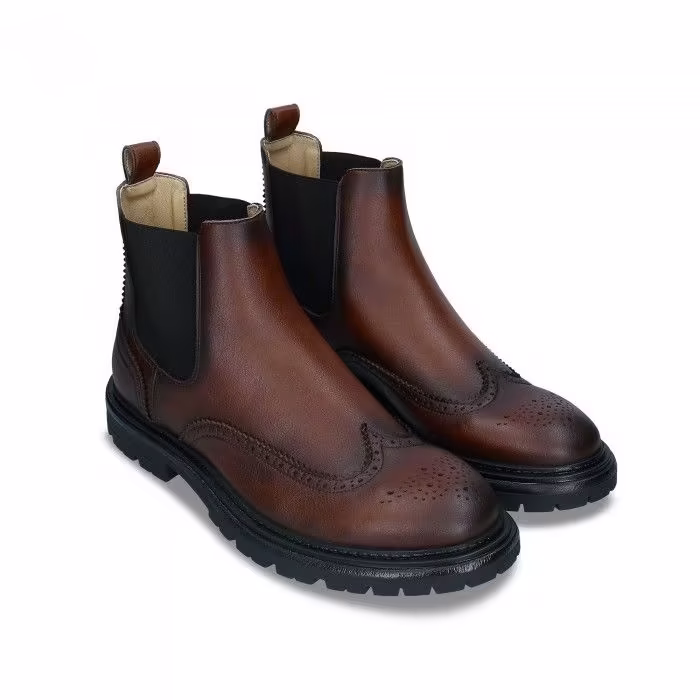 Découvrez les bottes chelsea pour homme sublimées par un bout brogue wing tip, tout en cuir végan haut de gamme Casian Marron et marchez avec classe et conscience.