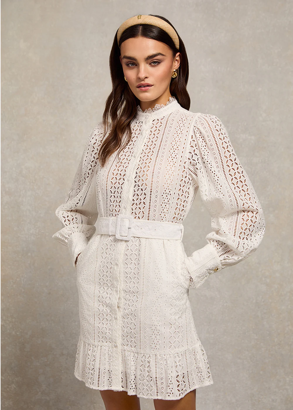 Key Features 100% cotton A line mini dress with frill hem Self fabric belt for tailored fit Full button down placket at front Broderie collarless shirt design Grandad collar with eyelash lace Fit GuidancePlease refer to our Size Guide for measurements. Code51600125114940