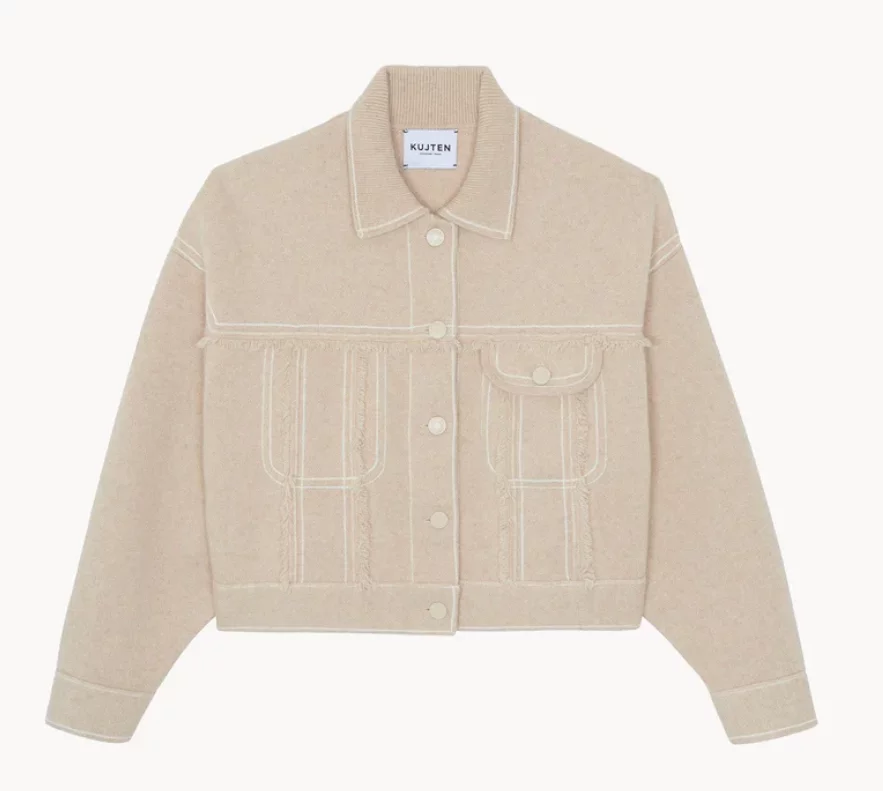 Kujten Arya : gilet en laine organique beige sublimé par des franges délicates et une allure décontractée sophistiquée.