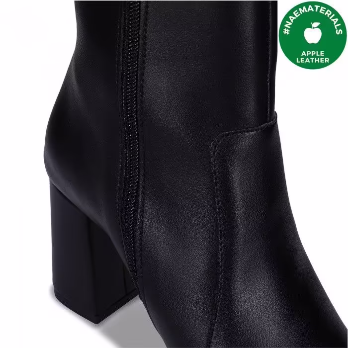 Découvrez Iona Black : des bottes habillées pour femme à talons hauts et tige au genou en cuir de pomme, véritable symbole de sophistication, de confort et de respect de la planète.