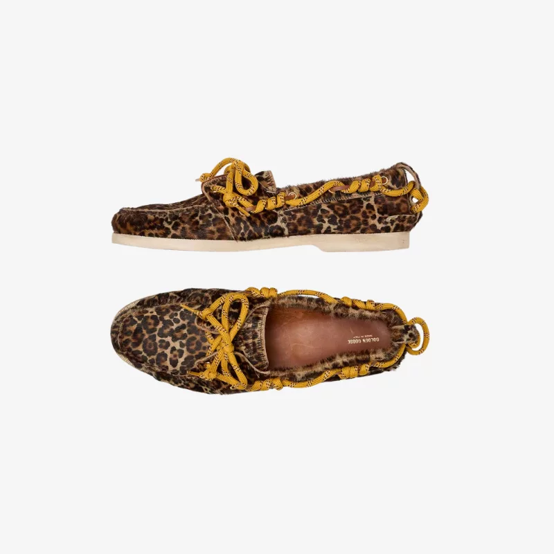 Un classique intemporel revisité dans le style Golden : nos Cruise sont une réinterprétation audacieuse de l’indémodable silhouette des mocassins. Cette version bateau pour femme se distingue par une tige en cuir façon poulain à imprimé léopard dans les tons du beige et du marron et par un cordon trekking classique jaune. Les touches en métal doré complètent le style.