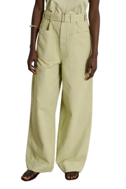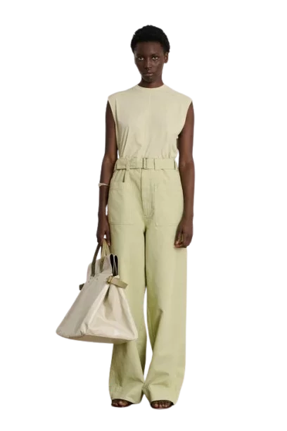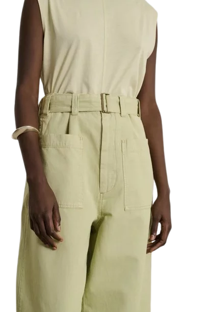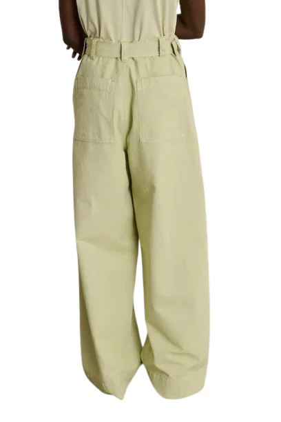 Le pantalon Vagabond de la marque Soeur est conçu dans un mélange de coton (54 %) et de lin (46 %), offrant une teinte sauge naturelle. Il présente une coupe ample avec des jambes très longues, une ceinture amovible assortie avec boucle, deux grandes poches plaquées à l’avant et à l’arrière, ainsi qu’un large ourlet en bas de jambe.