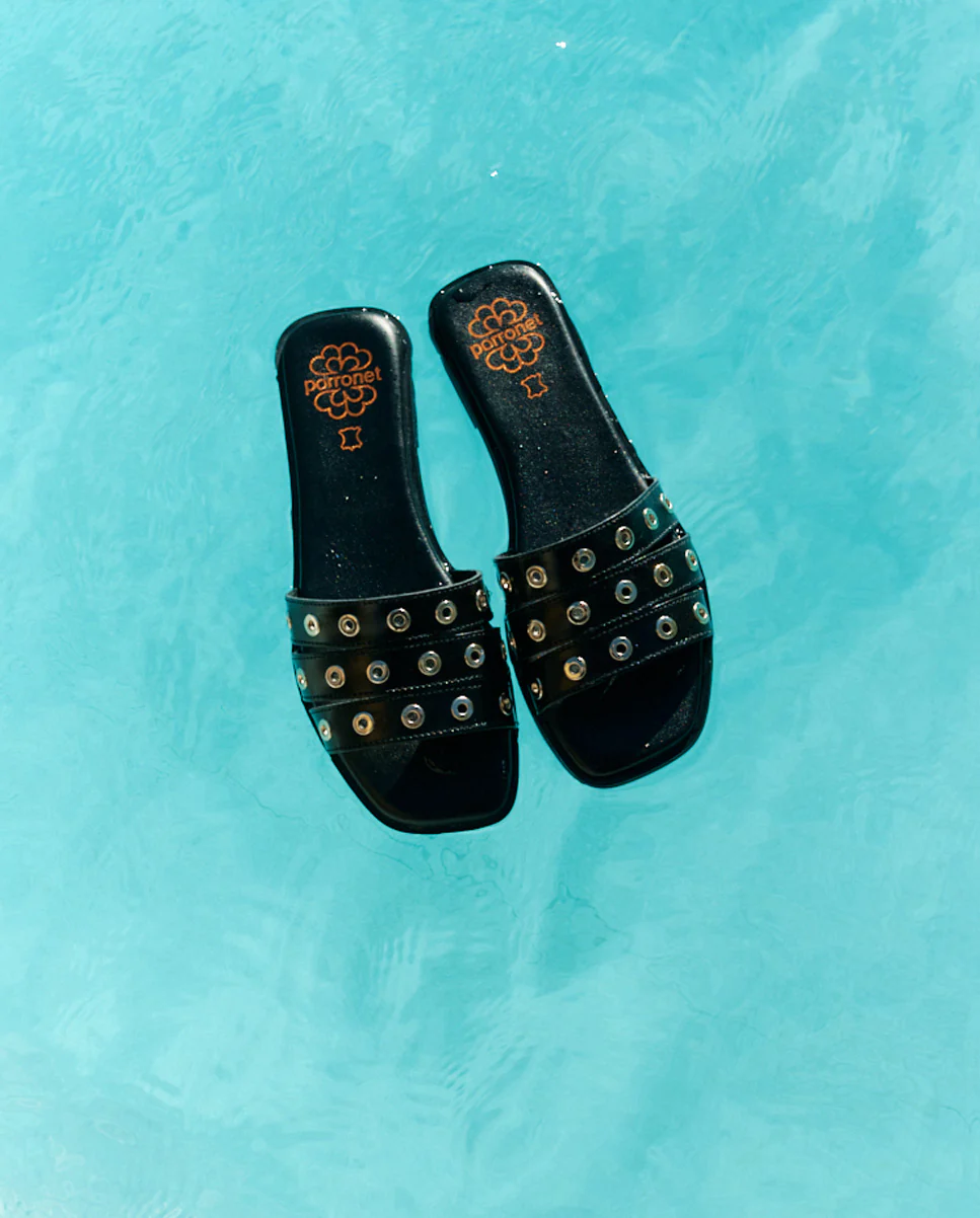 Sandale plate en cuir avec un talon plat et une bride sur le dessus ornée de clous métalliques. Dotée d’une semelle intérieure matelassée, cette sandale assure un confort à chaque pas et sa semelle antidérapante permet une plus grande stabilité. Fabrication artisanale 100% en Espagne