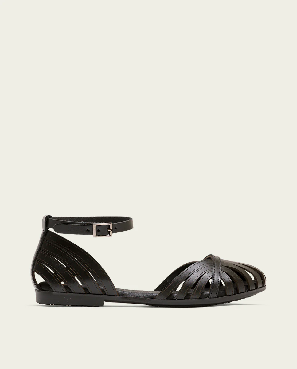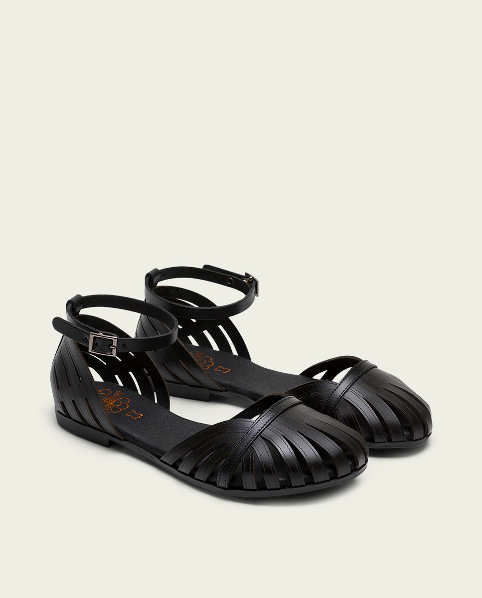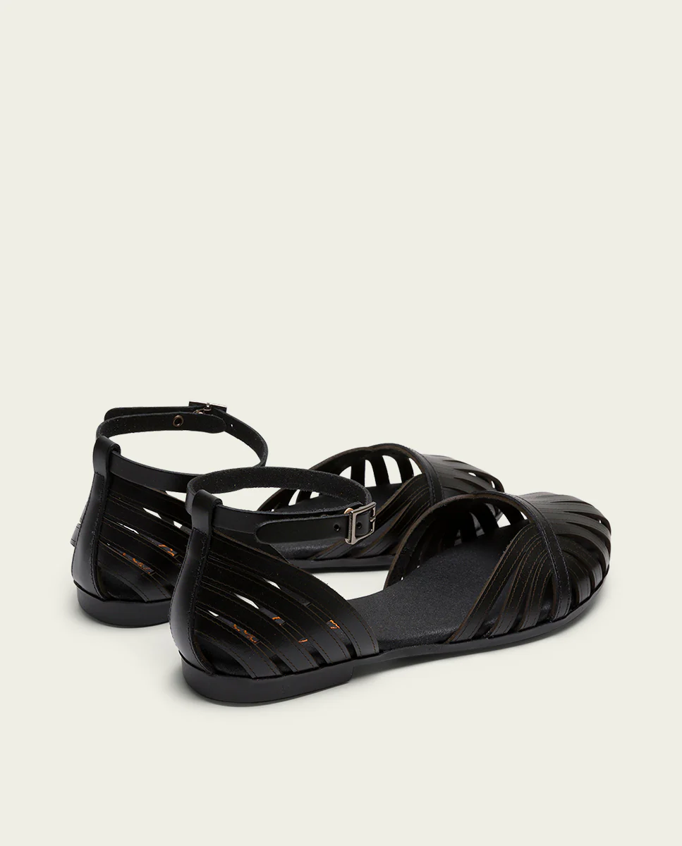 Sandales plates en cuir avec talon et empeigne perforés. Bride de cheville réglable en cuir avec fermeture à boucle. Semelle intérieure en cuir rembourrée qui garantit un grand confort. Semelle en caoutchouc souple antidérapante garantissant un grand confort. Fabriquées à la main en Espagne.