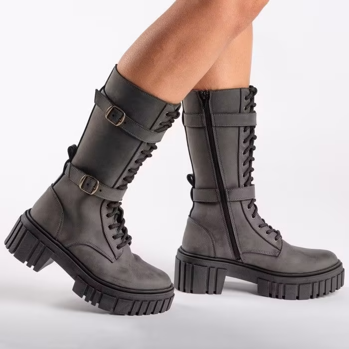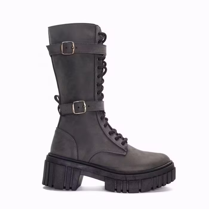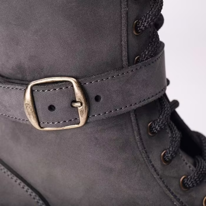 Optez pour la Seren Grey : une botte biker végan botte mi mollet style motard combinant le style audacieux et la sensualité discrète du nobuk végan.