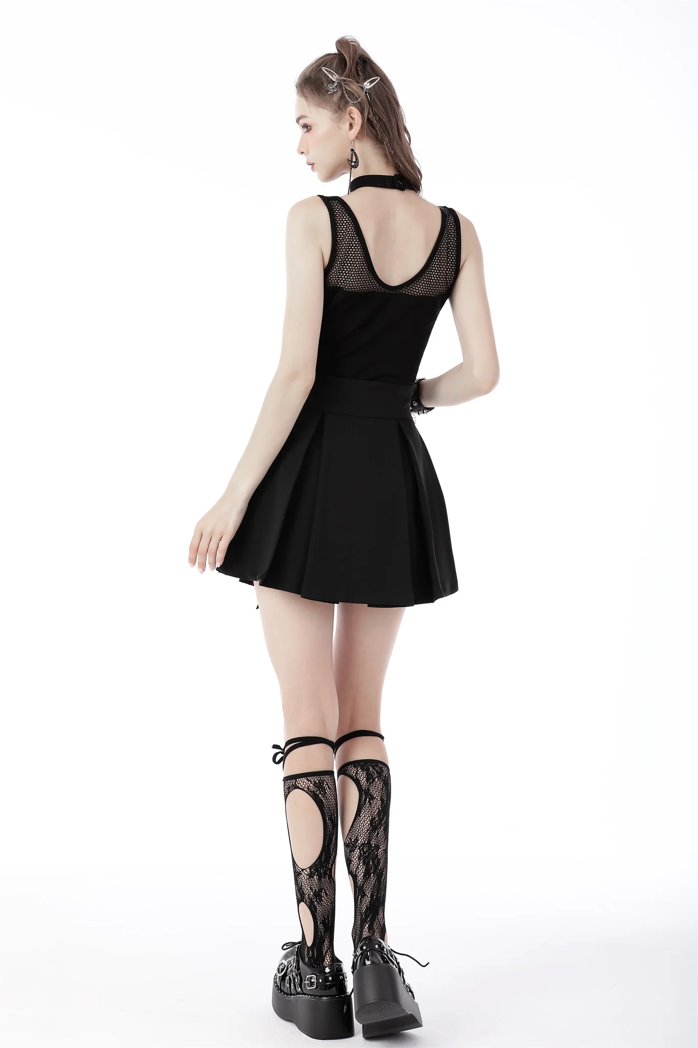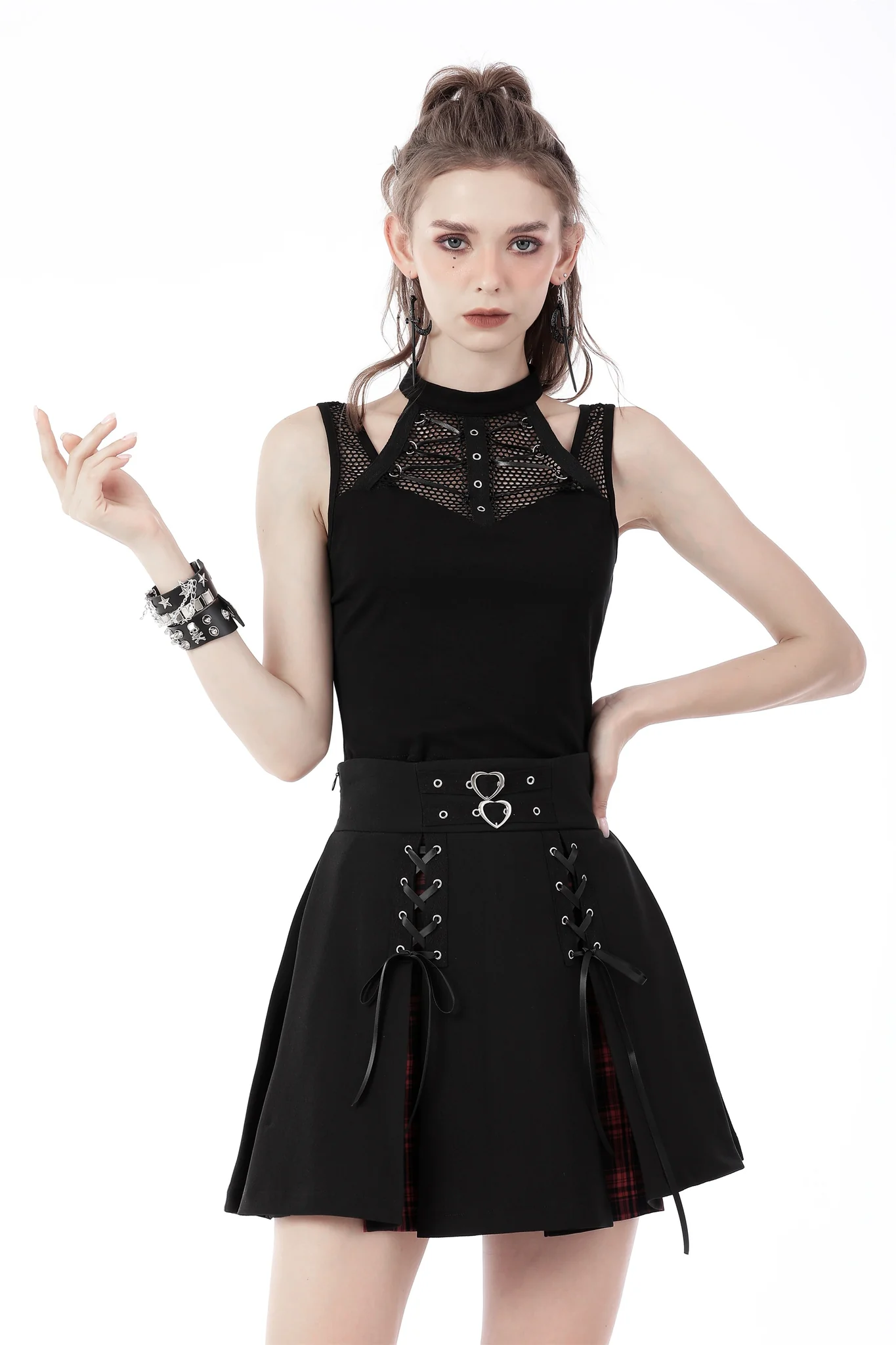 Ce top ajusté au style punk moderne combine tissu opaque et empiècements en résille pour un contraste percutant. Doté d’un col ras-du-cou avec fermeture bouton et d’un laçage ornemental à œillets sur le devant, il offre un look affirmé et structuré. Léger et près du corps, ce haut est parfait pour composer une tenue alternative originale tout en restant confortable.